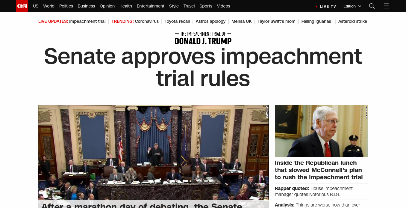 ” , title: “CNN – Breaking News, Latest News and Videos” , siblings: {“articleList”:[{“uri”:”/2020/01/21/politics/senate-impeachment-trial-day-1/index.html”,”headline”:”\u003cstrong>Day 1: \u003c/strong>Senate passes impeachment trial rules “,”thumbnail”:”//cdn.cnn.com/cnnnext/dam/assets/200121111547-schumer-mcconnell-split-small-11.jpg”,”duration”:””,”description”:”The Senate early Wednesday morning approved rules for the Senate \u003ca href=\”https://www.cnn.com/specials/politics/trump-impeachment\” target=\”_blank\”>impeachment\u003c/a> trial of President Donald Trump on a party-line vote that delays the question of whether the Senate should subpoena witnesses and documents until later in the trial.”,”layout”:””