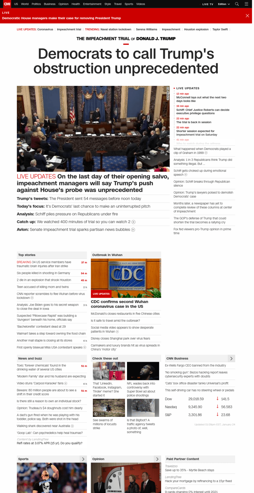 ” , title: “CNN – Breaking News, Latest News and Videos” , siblings: {“articleList”:[{“uri”:”/2020/01/24/politics/senate-impeachment-trial-day-4/index.html”,”headline”:”u003cstrong>Today’s focus: u003c/strong>It’s Democrats’ last chance to make an uninterrupted pitch”,”thumbnail”:”//cdn.cnn.com/cnnnext/dam/assets/200124121859-02-schiff-impeachment-managers-arrive-0123-small-11.jpg”,”duration”:””,”description”:”House Intelligence Chairman u003ca href=”https://www.cnn.com/2020/01/22/politics/adam-schiff-senate-impeachment-trial-2020/index.html” target=”_blank”>Adam Schiff u003c/a>and the u003ca href=”https://www.cnn.com/2020/01/15/politics/what-is-an-impeachment-manager-explainer/index.html” target=”_blank”>impeachment managers u003c/a>finish their opening arguments on Friday in what’s their final chance to make an uninterrupted pitch to senators on the fence that they should hear from more witnesses in the impeachment trial of President Donald Trump.”,”layout”:””