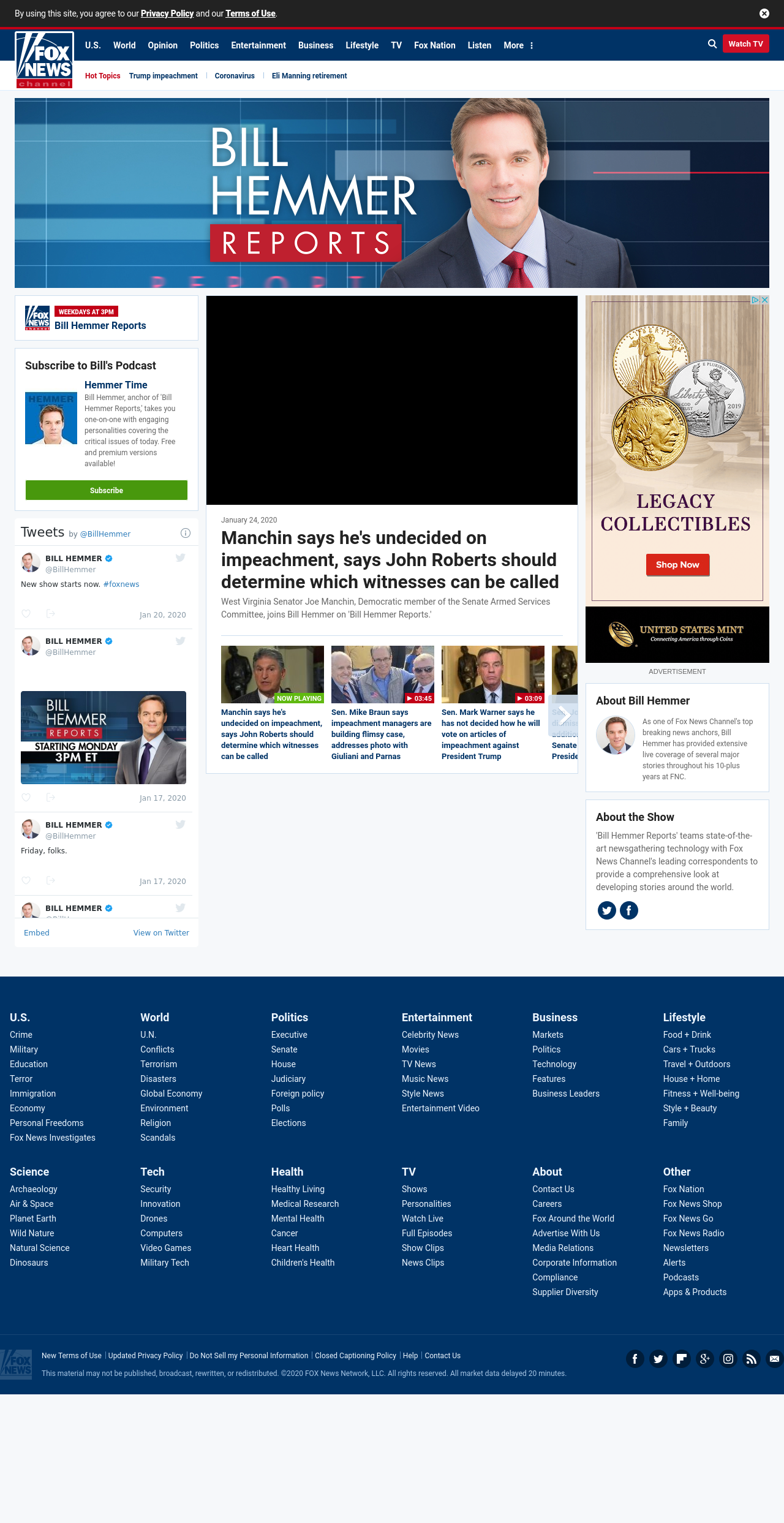 West Virginia Senator Joe Manchin, Democratic member of the Senate Armed Services Committee, joins Bill Hemmer on ‘Bill Hemmer Reports.’