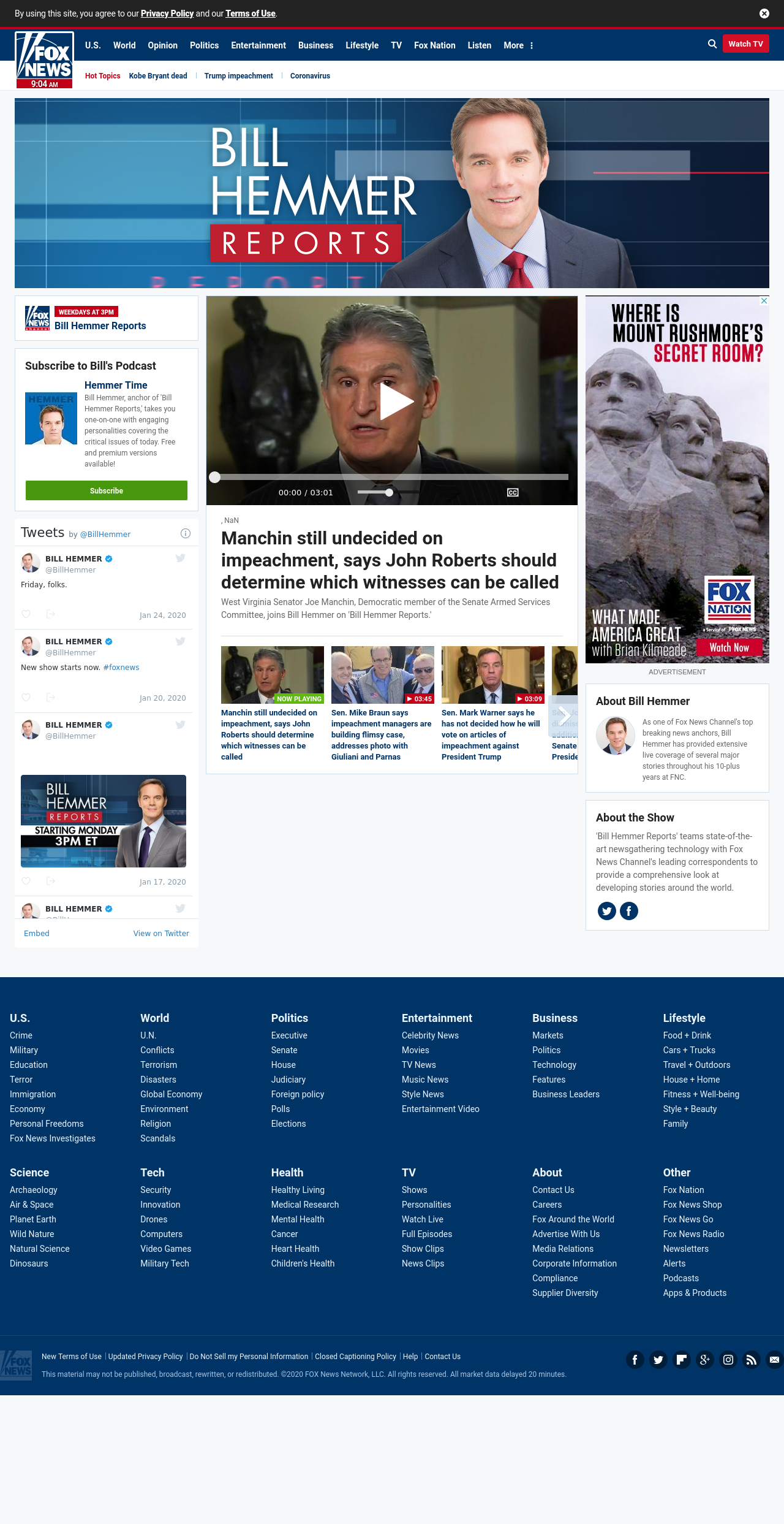 BH: Manchin still undecided on impeachment, says John Roberts should determine which witnesses can be called ((billhemmer________)) ((lubuntu at wor1))