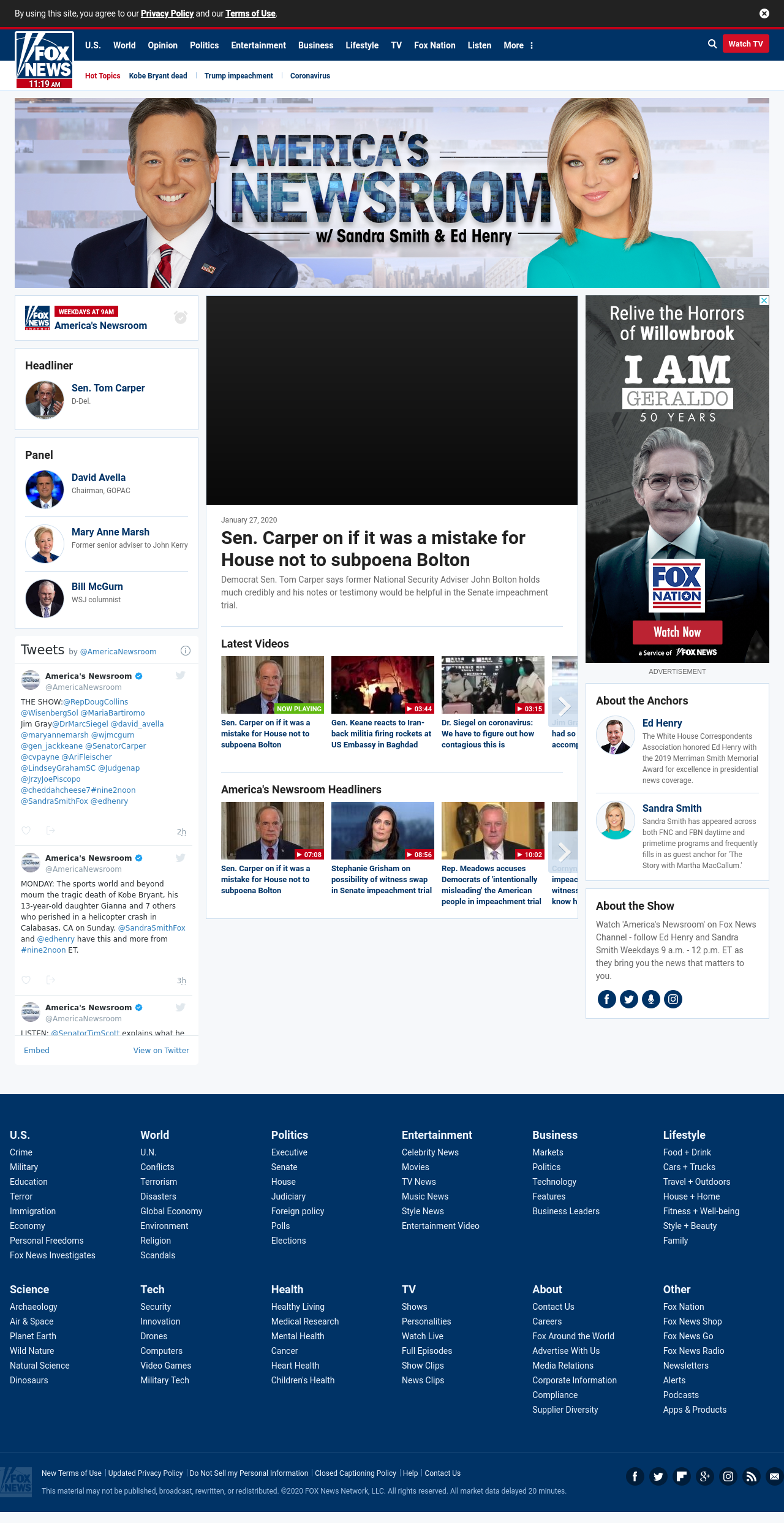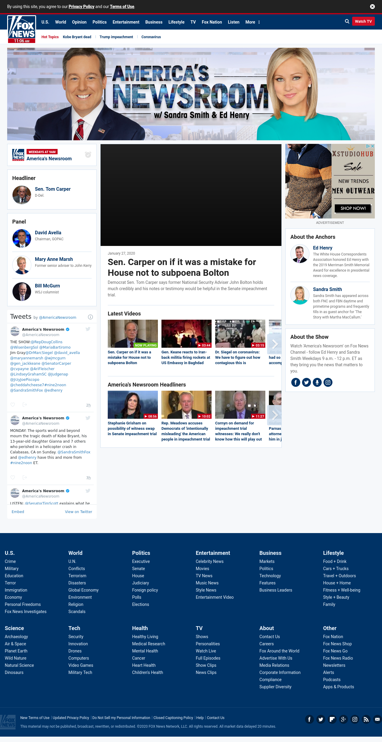 AN: Sen. Carper on if it was a mistake for House not to subpoena Bolton ((americasnewsroom__)) ((lubuntu at wor1))