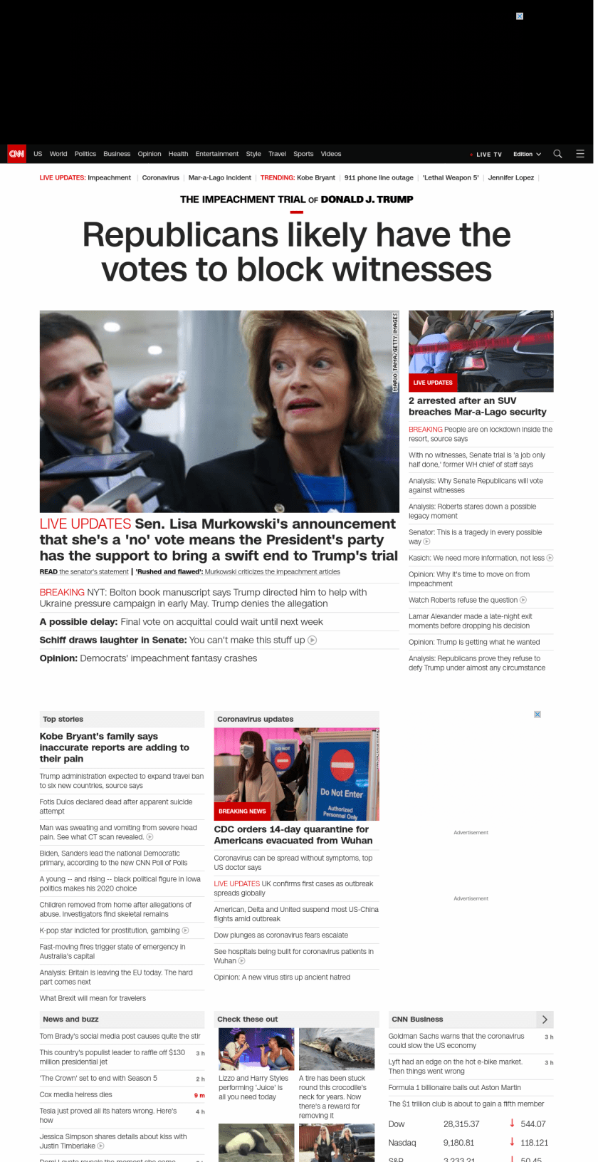 ” , title: “CNN – Breaking News, Latest News and Videos” , siblings: {“articleList”:[{“uri”:”/politics/live-news/trump-impeachment-trial-01-31-20/index.html”,”headline”:”u003cstrong>Sen. Lisa Murkowski’s announcement that she’s a ‘no’ vote means the President’s party has the support to bring a swift end to Trump’s trialu003c/strong>”,”thumbnail”:”//cdn.cnn.com/cnnnext/dam/assets/200131131801-01-senate-trial-0131-small-11.jpg”,”duration”:””,”description”:”u003ca href=”https://www.cnn.com/2020/01/31/politics/murkowski-impeachment-vote-statement/index.html” target=”_blank”>u003cstrong>READu003c/strong> the senator’s statementu003c/a>u003cstrong> | u003c/strong>u003ca href=”https://www.cnn.com/2020/01/31/politics/senate-impeachment-trial-last-day/index.html” target=”_blank”>u003cstrong>’Rushed and flawed’:u003c/strong> Murkowski criticizes the impeachment articlesu003c/a>”,”layout”:””