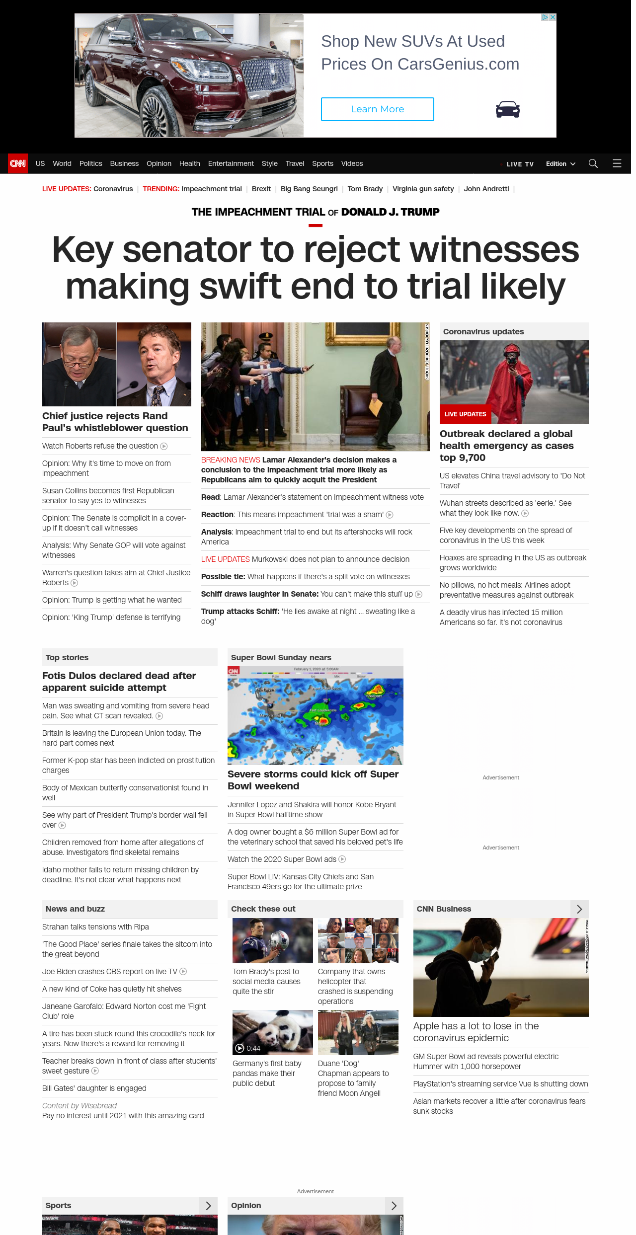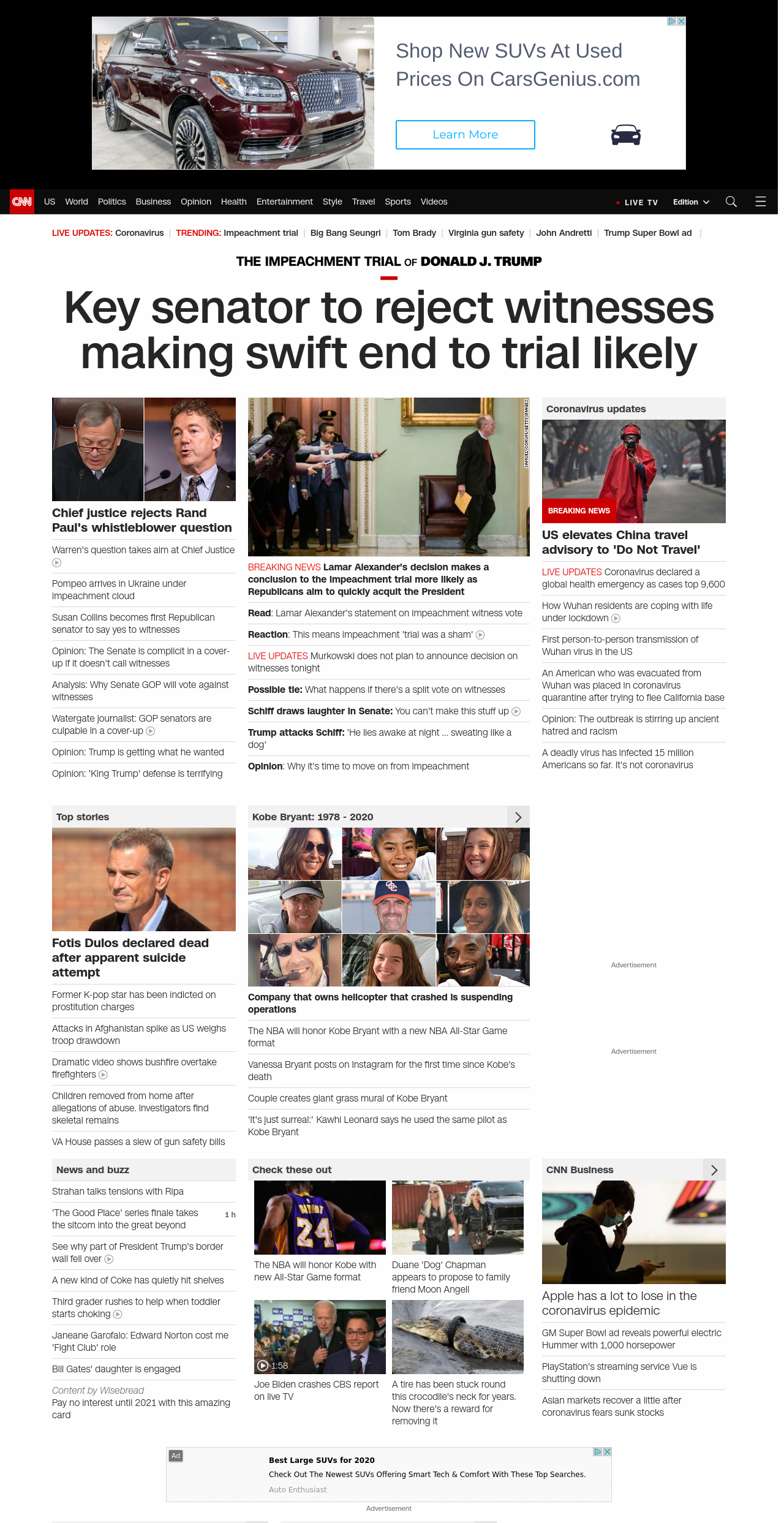 ” , title: “CNN – Breaking News, Latest News and Videos” , siblings: {“articleList”:[{“uri”:”/2020/01/30/politics/senate-impeachment-trial-second-day-of-questions/index.html”,”headline”:”u003cstrong>Witness vote likely to fail after GOP senator says he’s a nou003c/strong>”,”thumbnail”:”//cdn.cnn.com/cnnnext/dam/assets/200130231448-02-trump-impeachment-0130-lamar-alexander-small-11.jpg”,”duration”:””,”description”:””,”layout”:””