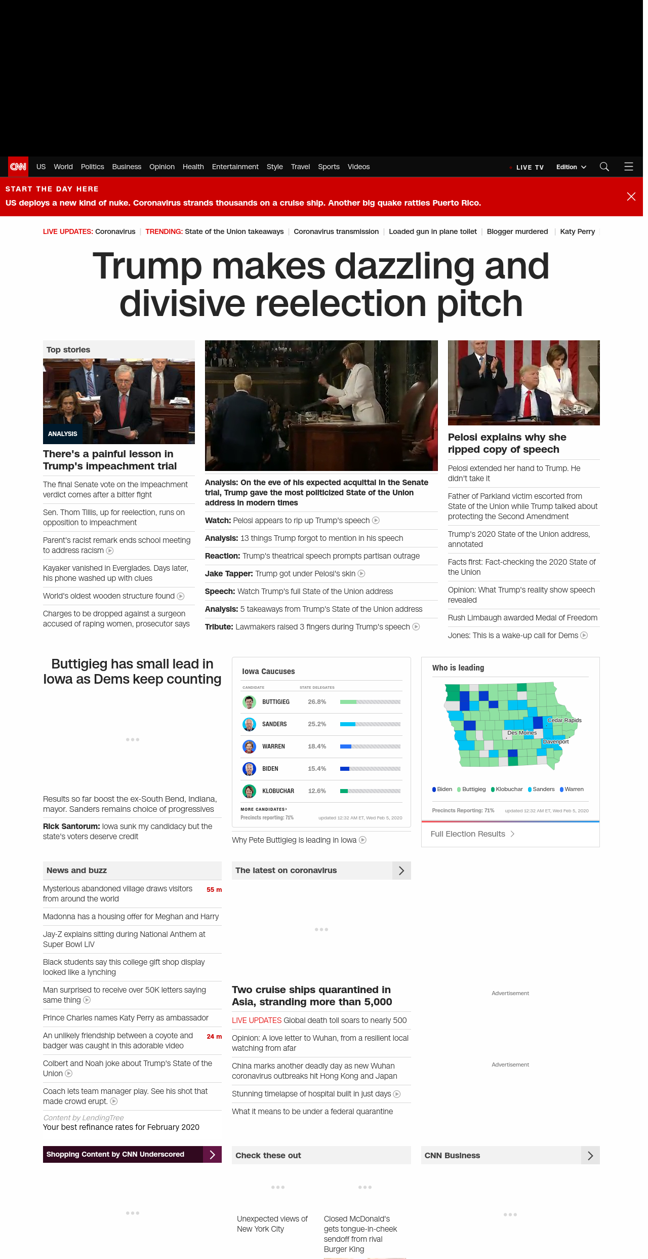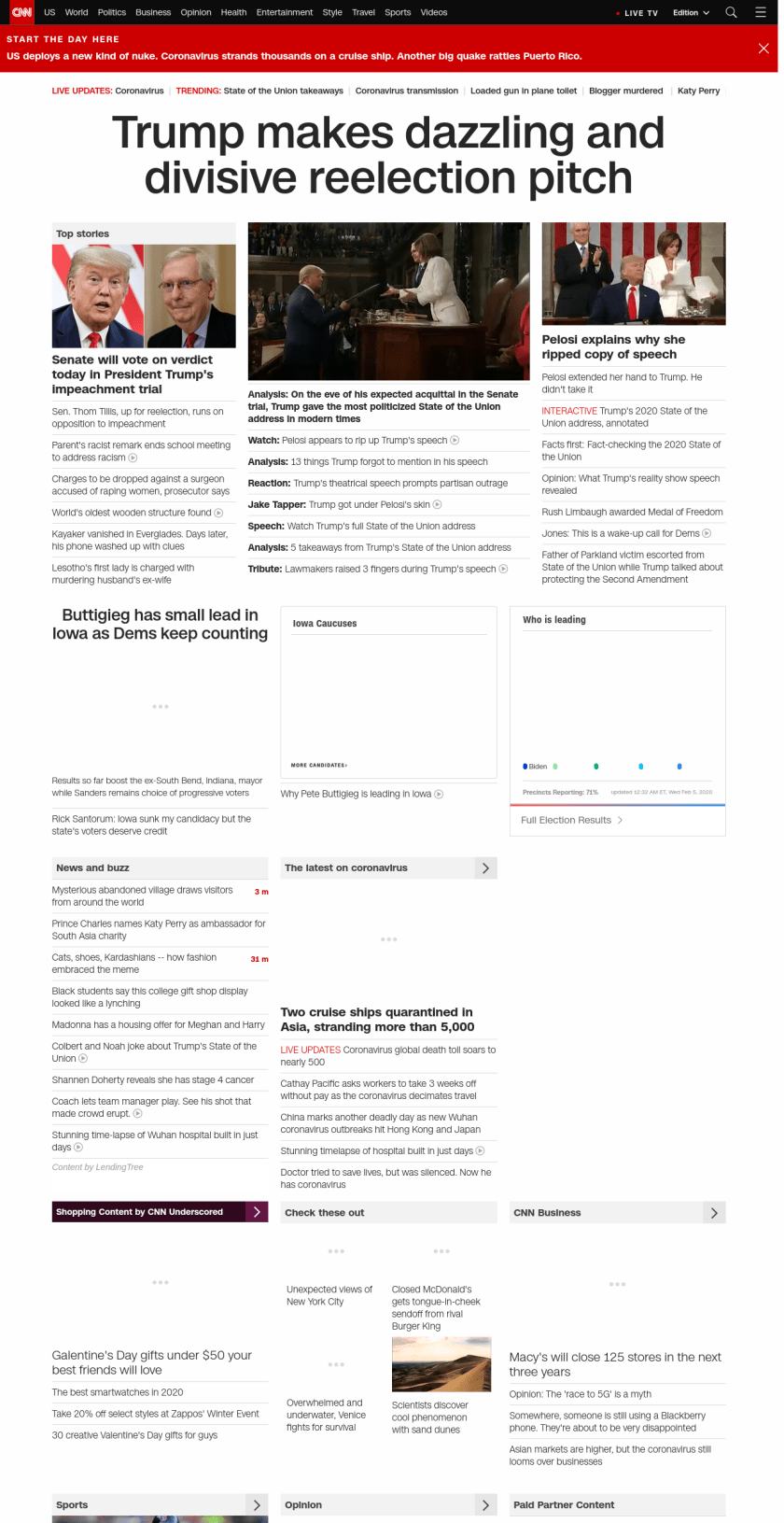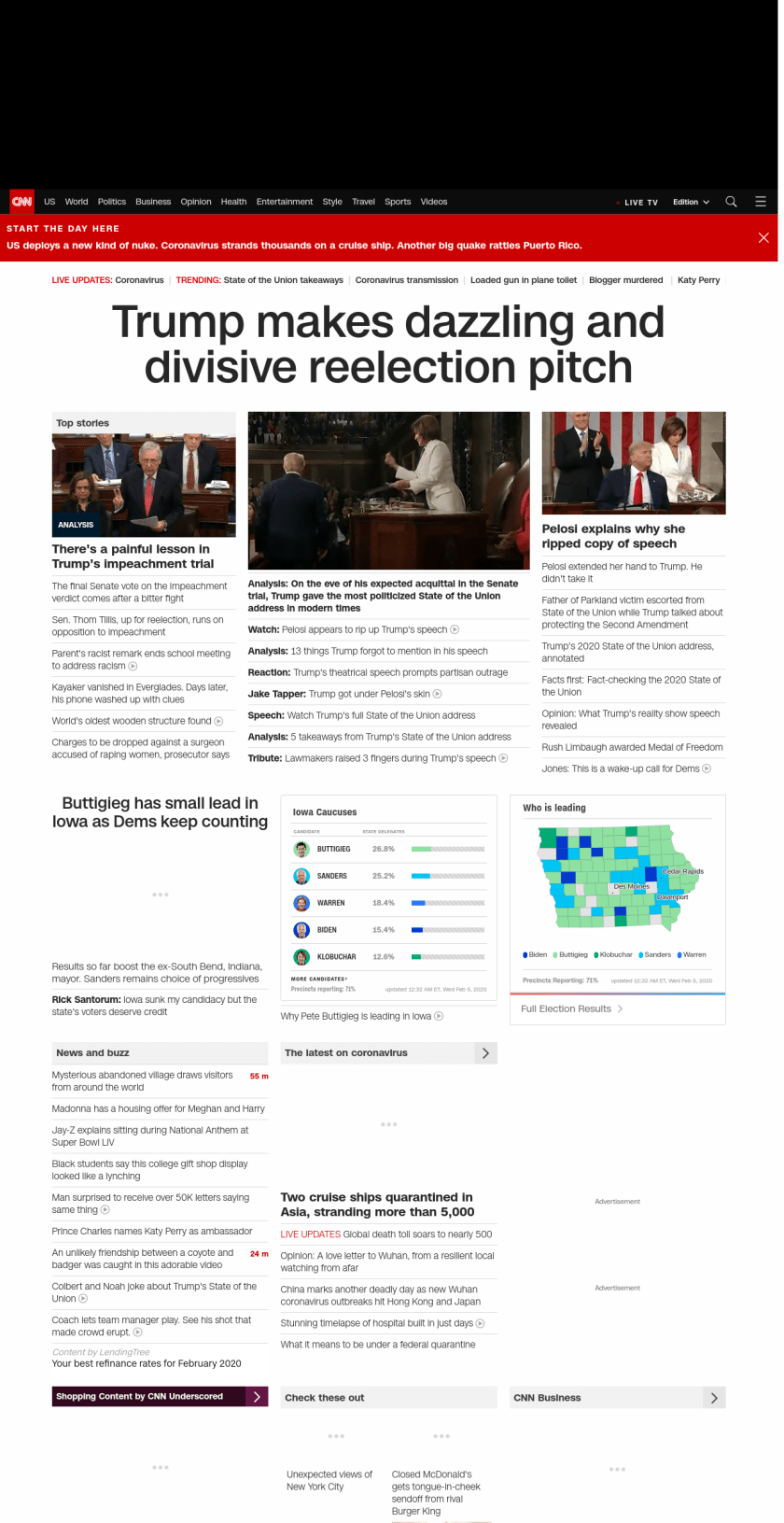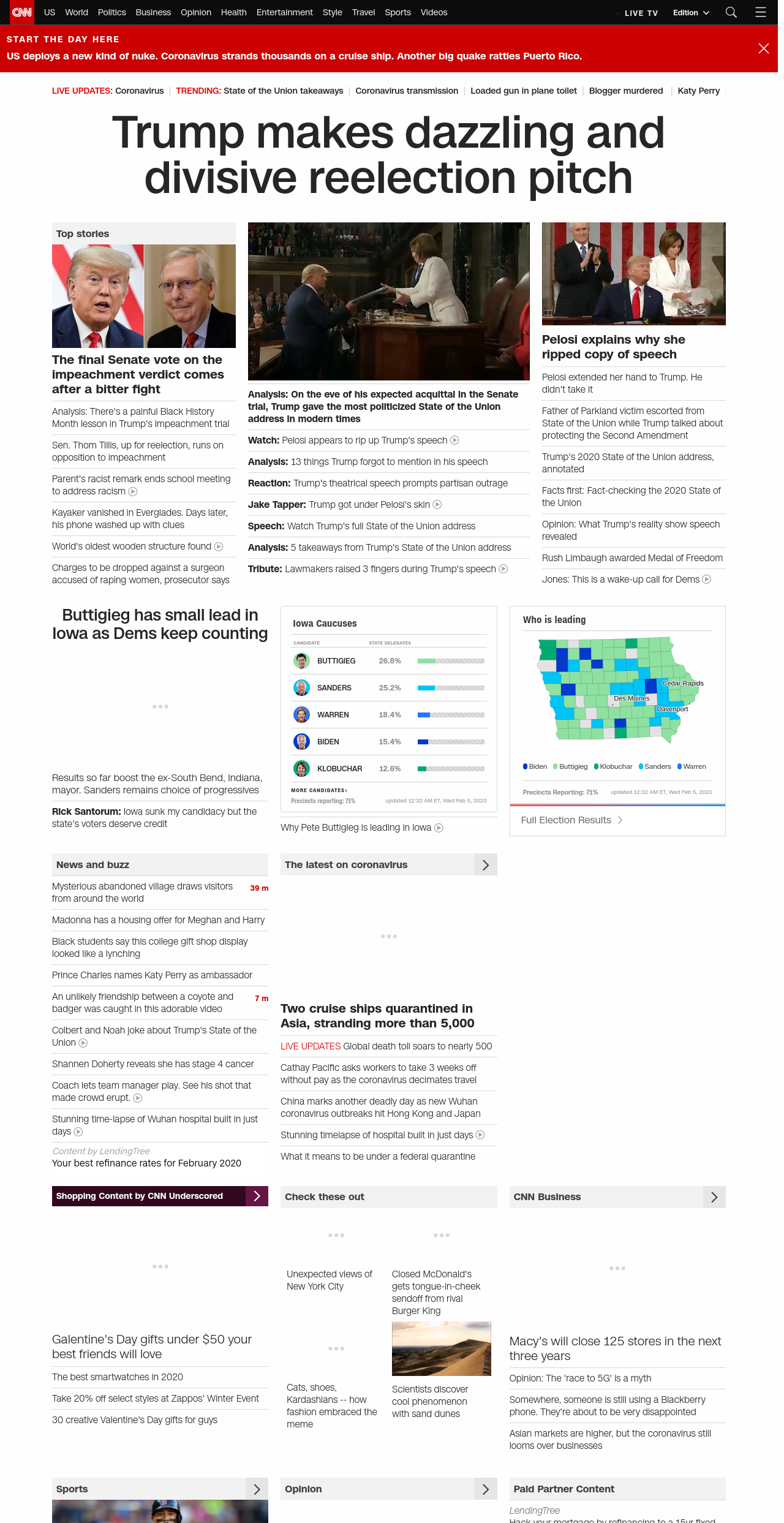 || Trump makes dazzling and divisive reelection pitch ||” , title: “CNN – Breaking News, Latest News and Videos” , siblings: {“articleList”:[{“uri”:”/2020/02/05/politics/senate-impeachment-trial-vote-acquittal/index.html”,”headline”:”u003cstrong>Senate will vote on verdict today in President Trump’s impeachment trialu003c/strong>”,”thumbnail”:”//cdn.cnn.com/cnnnext/dam/assets/200130105634-02-trump-mcconnell-split-small-11.jpg”,”duration”:””,”description”:”The third u003ca href=”https://www.cnn.com/specials/politics/trump-impeachment” target=”_blank”>Senate impeachment trial u003c/a>of a sitting President in US history will come to an end Wednesday with a vote that’s expected to acquit Donald Trump.”,”layout”:””