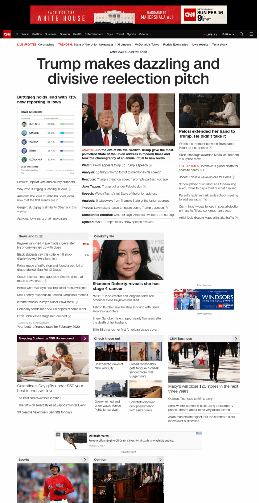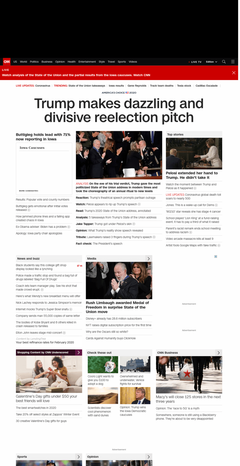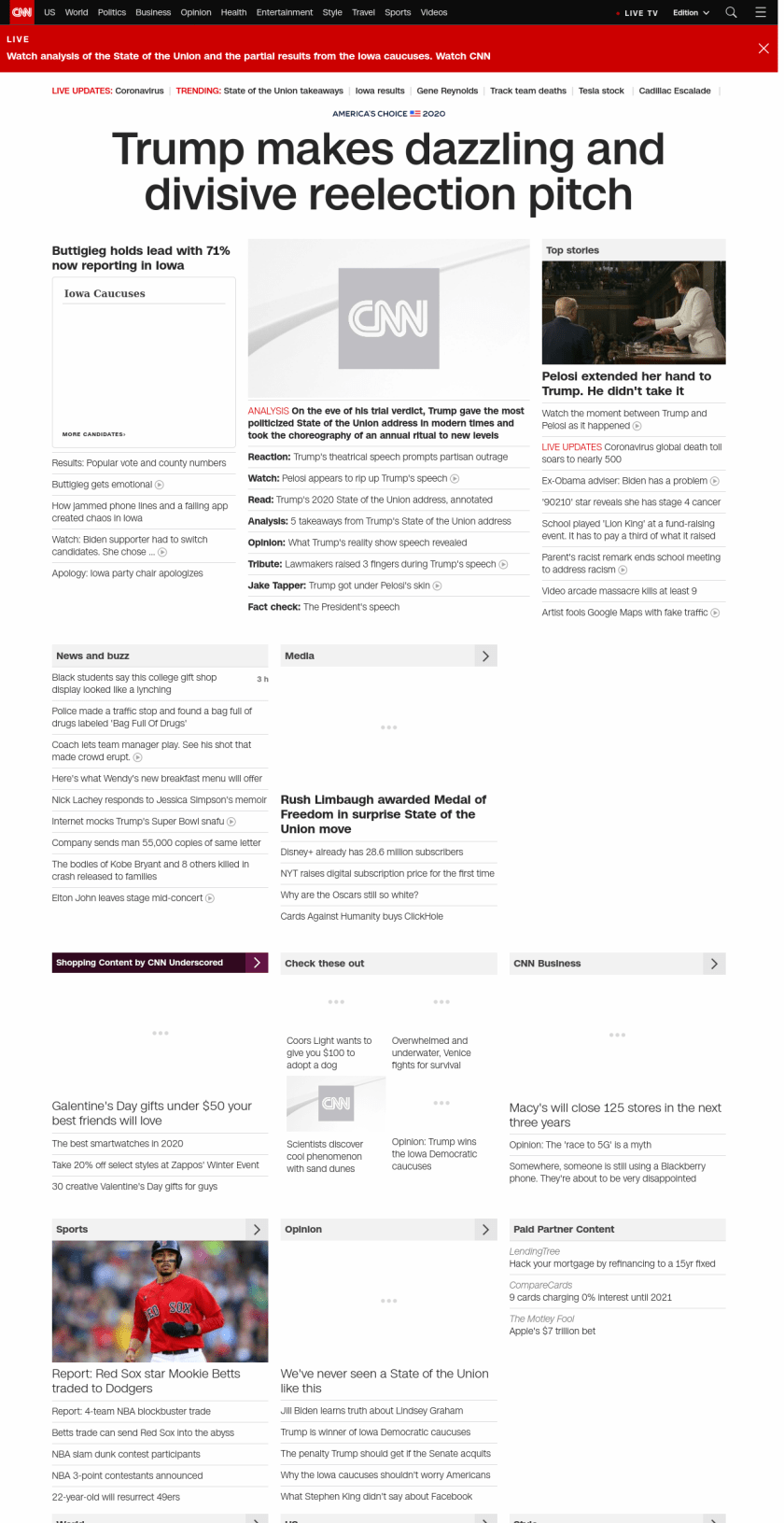 || Trump makes dazzling and divisive reelection pitch ||” , title: “CNN – Breaking News, Latest News and Videos” , siblings: {“articleList”:[{“uri”:”/videos/politics/2020/02/04/pete-buttigieg-iowa-lead-sot-vpx.cnn”,”headline”:”Buttigieg gets emotional after initial votes released”,”thumbnail”:”//cdn.cnn.com/cnnnext/dam/assets/200204181759-buttigieg-iowa-leader-small-11.jpg”,”duration”:”01:38″,”description”:”Democratic candidate Pete Buttigieg spoke to supporters after learning he is leading in the Iowa caucuses with 62 percent of the results reported.”,”layout”:””,”iconType”:”video”