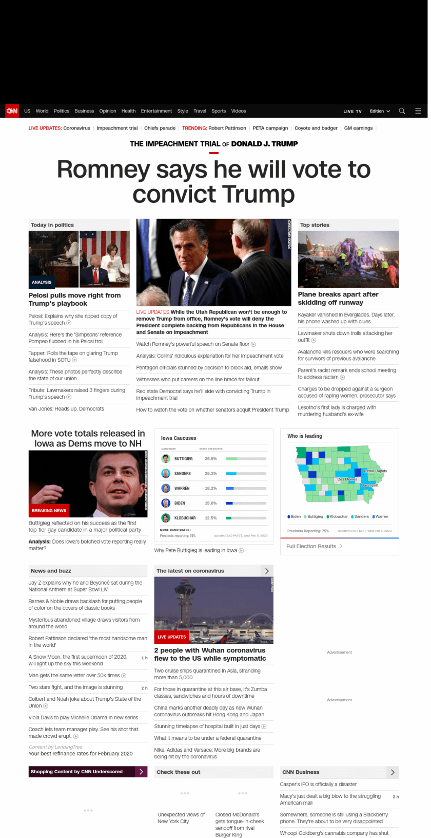 || Romney says he will vote to convict Trump ||” , title: “CNN – Breaking News, Latest News and Videos” , siblings: {“articleList”:[{“uri”:”/2020/02/05/politics/black-voters-trump-state-of-the-union/index.html”,”headline”:”At Trump’s State of the Union, the bigotry was in plain sight”,”thumbnail”:”//cdn.cnn.com/cnnnext/dam/assets/200204213431-28-sotu-2020-small-11.jpg”,”duration”:””,”description”:”As on so many other occasions during his presidency, President Donald Trump on Tuesday night showed that he’s ever the showman, having used part of u003ca href=”http://www.cnn.com/2020/02/04/politics/state-of-the-union-2020-donald-trump/index.html” target=”_blank”>his third official State of the Union addressu003c/a> to ostensibly pander to black voters as he vies for another term in the White House.”,”layout”:””