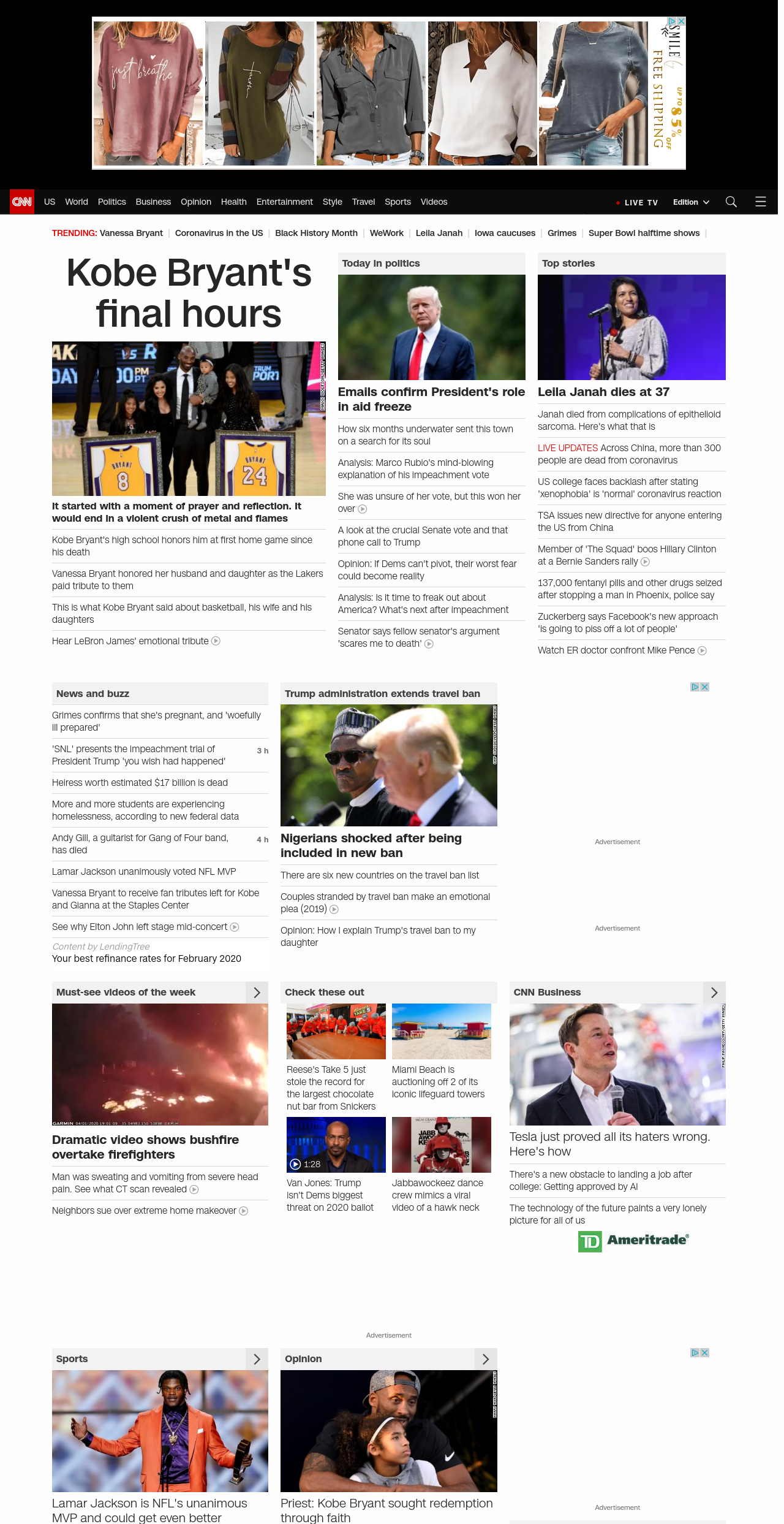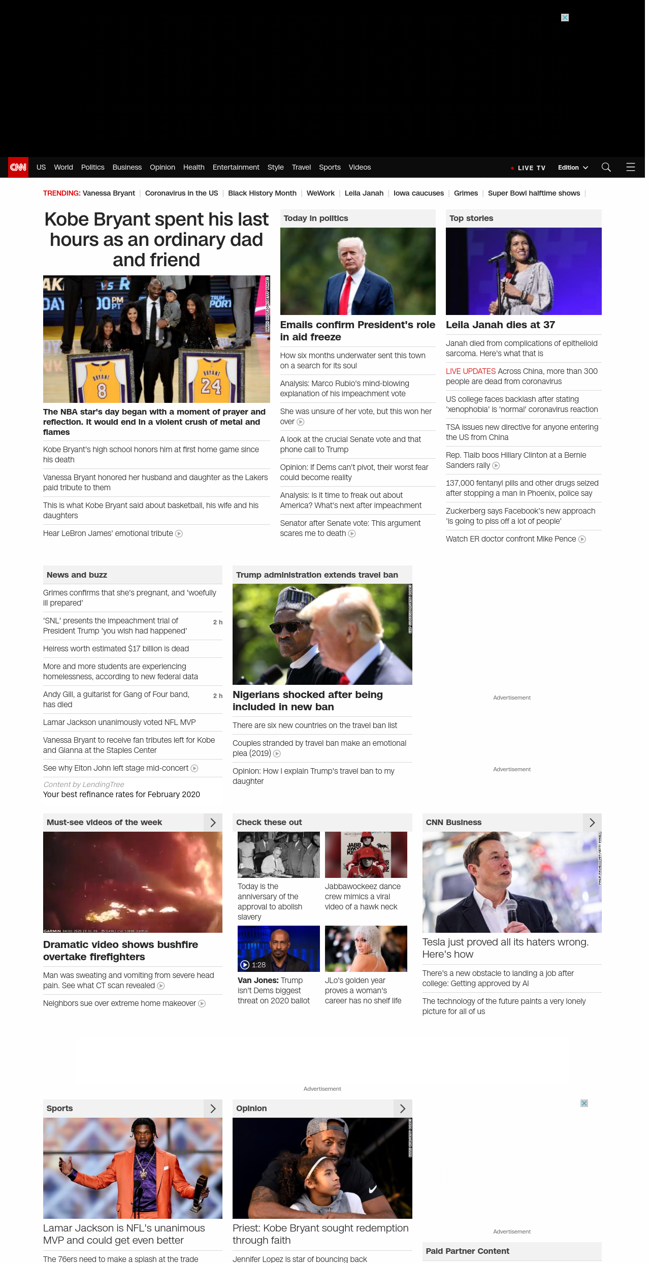 ” , title: “CNN – Breaking News, Latest News and Videos” , siblings: {“articleList”:[{“uri”:”/2020/02/02/us/kobe-bryant-final-hours/index.html”,”headline”:”u003cstrong>The NBA star’s day began with a moment of prayer and reflection. It would end in a violent crush of metal and flamesu003c/strong>”,”thumbnail”:”//cdn.cnn.com/cnnnext/dam/assets/200126152125-04-kobe-bryant-gallery-small-11.jpg”,”duration”:””,”description”:”In the vast sanctuary of Our Lady Queen of Angels Catholic Church, a larger-than-life figure mixed with ordinary parishioners in the final hours of his storied life.”,”layout”:””